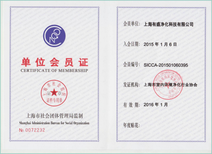 上海有盛净化室内环境净化行业协会会员证书